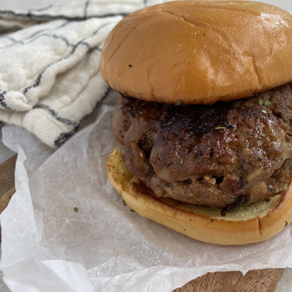 Heat a skillet over medium-low heat. Fry burgers until browned and centers reach 165 degrees F (74 degrees C), 6 to 7 minutes per side. Serve on buns.