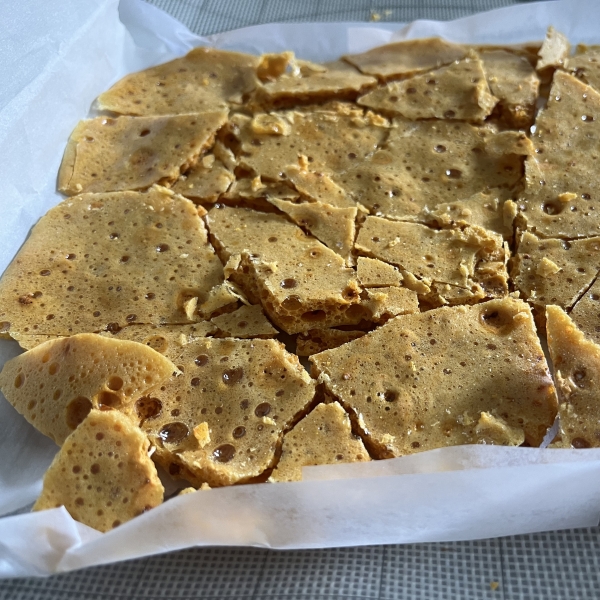 This very fun and simple-to-make honeycomb recipe goes by many names; cinder toffee, sponge candy, and my personal favorite, "hokey pokey," but no matter what you call it, this eye-catching confection is a proven crowd-pleaser. Thousands of bubbles, trapped in the cooling sugar syrup, give this the most interesting melt-in-your-mouth texture. As long as you're very careful and heat the syrup up to the correct temp, there's not a lot that can go wrong.