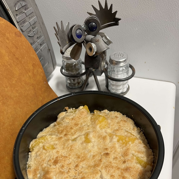 Mix peaches with 1/2 of the cake mix mixture; place in a 6-inch round dish. Top peaches with remaining cake mix mixture. Cover dish with foil.