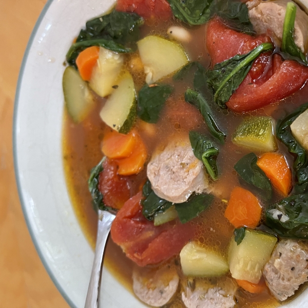 This Italian sausage soup is easy to put together. The flavor of the spicy sausage is balanced nicely by the addition of white beans and spinach.