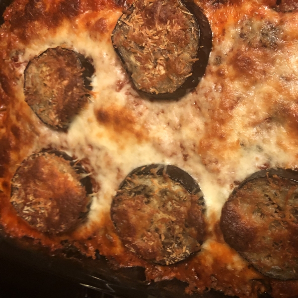Roasted eggplant strips take the place of pasta strips and feta cheese takes the place of mozarella. This is a fun and delicious twist on the Italian favorite.
