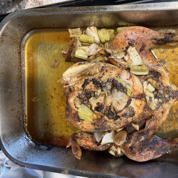 My grandmother's recipe for roasted chicken. We are German and she used to do it this way all the time. I never have had a chicken this juicy before; this little trick works and makes the people eating it go silent. It's funny. We nibble on the celery after.