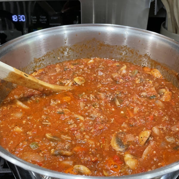 This sauce came from a good friend's Italian mother-in-law. It is easy, and by far the best homemade sauce I know of. Great for both spaghetti and lasagna. Pssst...the secret is the sugar! Also, as I am now vegetarian, it tastes great with out the meat! Just substitute two tablespoons olive oil for the beef.