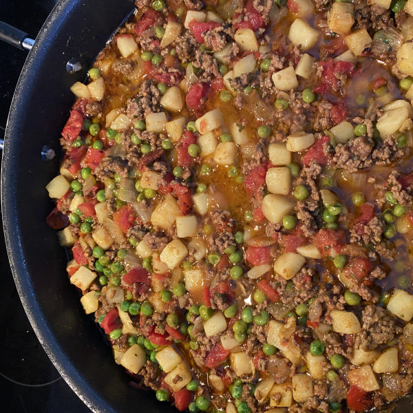 This keema aloo curry recipe combines ground beef with potatoes, tomatoes, peas, ginger, cilantro, and lots of Indian spices for a flavor-packed meal.
