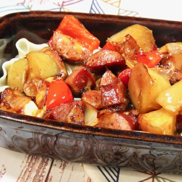 Enjoy a quick sausage supper with this simple recipe that combines sliced kielbasa with sauteed apples, peppers, and onions, all topped with melty Cheddar cheese.