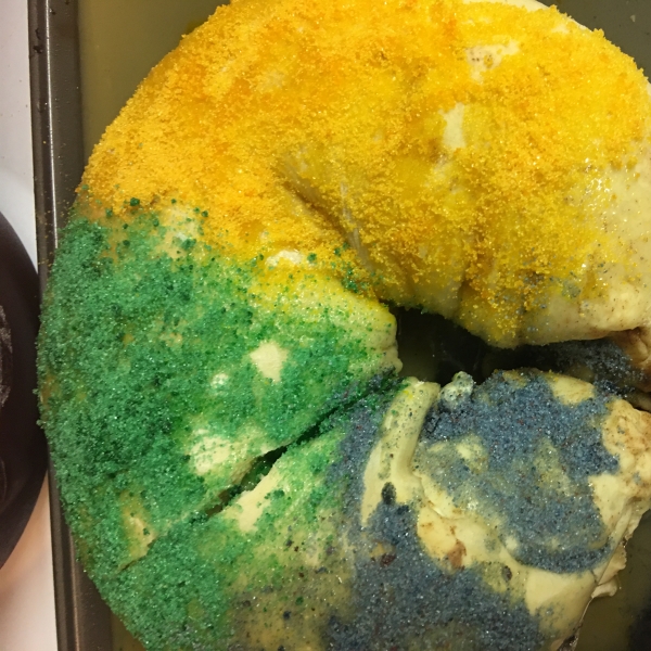 Make your Mardi Gras king cake using your bread machine to mix and knead the dough. Fill the dough with a buttery cinnamon-pecan filling, bake, and decorate with a frosting glaze and purple, green, and gold colored sugar.