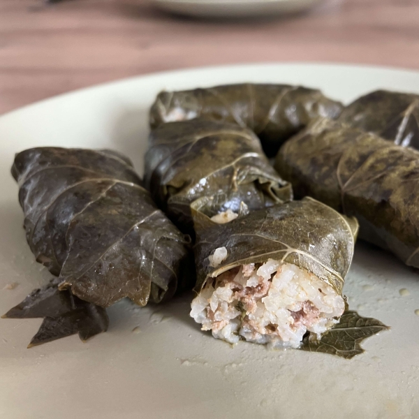 Gently unroll and separate grape leaves. Rinse in cold water to remove brine. Drain. Reserve broken or less-than-perfect leaves to line pot.