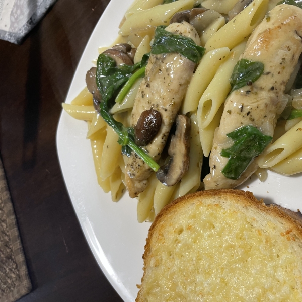 Add cooked pasta to the skillet and toss until well combined with the sauce. Add chicken and mushrooms, adjust seasoning to taste, and serve immediately.