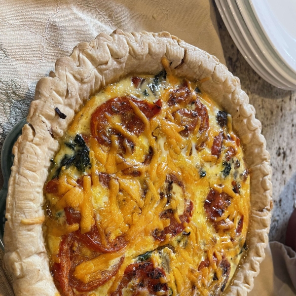 Spread 1 cup cheese in the bottom of pie crust. Layer vegetable mixture over the cheese, then top with tomato slices. Pour egg mixture over top and sprinkle with remaining 1/2 cup cheese.