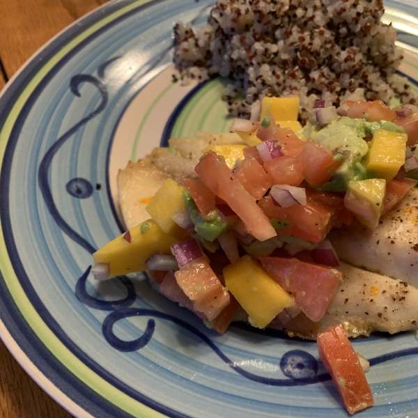 My son's girlfriend, Nicole, named this 'mango-licous'. The mango salsa is great over the tilapia, as a dip or on cottage cheese. Try serving the tilapia over brown basmati rice or lightly dressed salad greens for a complete meal. Then generously top with the salsa. Mango-licious!!