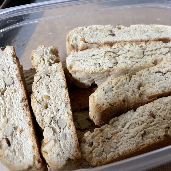Bake biscotti in the preheated oven until lightly browned and crisp on the outside, about 8 minutes. Remove from oven; cool for a few minutes.