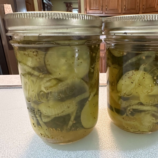 Cucumbers and onion are cooked in a sweet and sour pickling mixture in the microwave and stashed in the refrigerator for an easy version of bread-and-butter pickles.