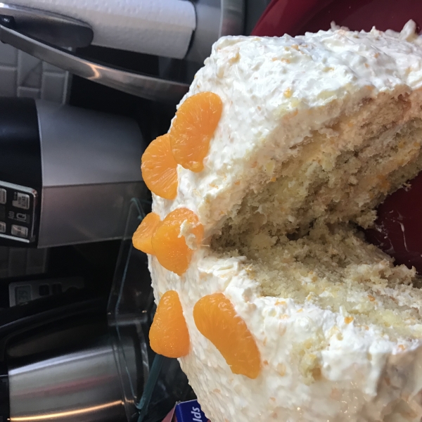 Place one cake layer on a cake plate cut side up; spread with frosting. Place another layer cut side down on the first one, and top with more frosting. Repeat until all layers are used, spreading last bit of frosting on top and sides of cake. Decorate with reserved mandarin orange slices. Refrigerate overnight before serving.