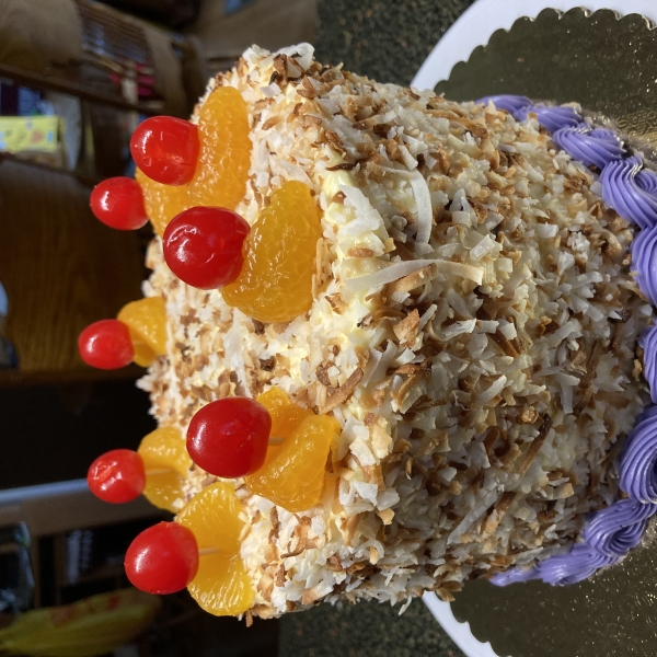 Place one cake layer on a cake plate cut side up; spread with frosting. Place another layer cut side down on the first one, and top with more frosting. Repeat until all layers are used, spreading last bit of frosting on top and sides of cake. Decorate with reserved mandarin orange slices. Refrigerate overnight before serving.