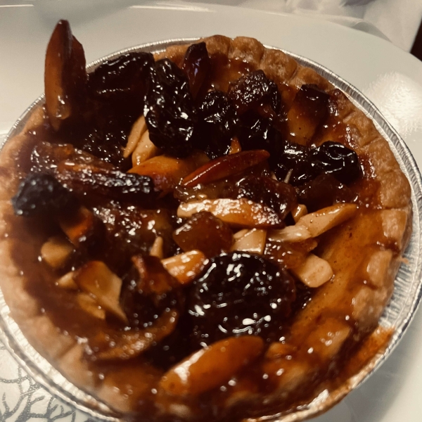Prepare mincemeat: Combine apple, sultanas, sugar, currants, raisins, and butter in a saucepan. Cook over low heat and stir gently until butter has melted. Stir in chopped almonds, orange zest, 1 teaspoon mixed spice, and cinnamon.