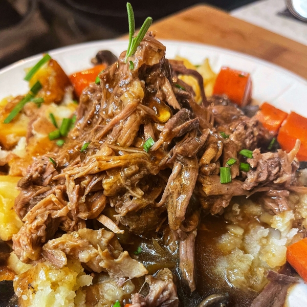 Remove chuck from slow cooker; shred with 2 forks and serve with gravy.