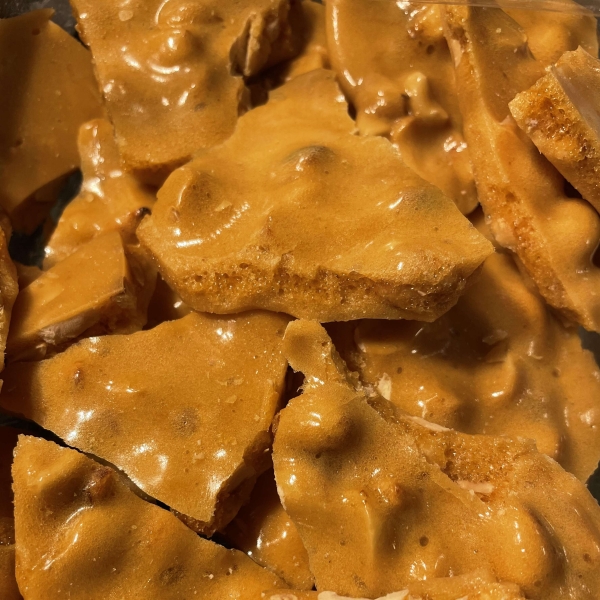 Stir in peanuts and set a candy thermometer in place. Continue cooking, stirring occasionally, until the temperature reaches 300 to 310 degrees F (150 to 155 degrees C)