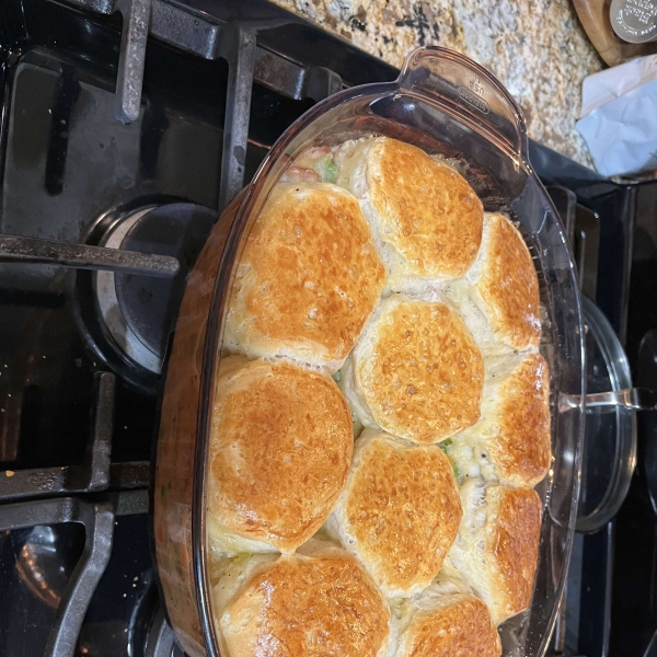 This delicious chicken pot pie with biscuits is a comforting dinner that's quick to put together with simple ingredients from your kitchen.