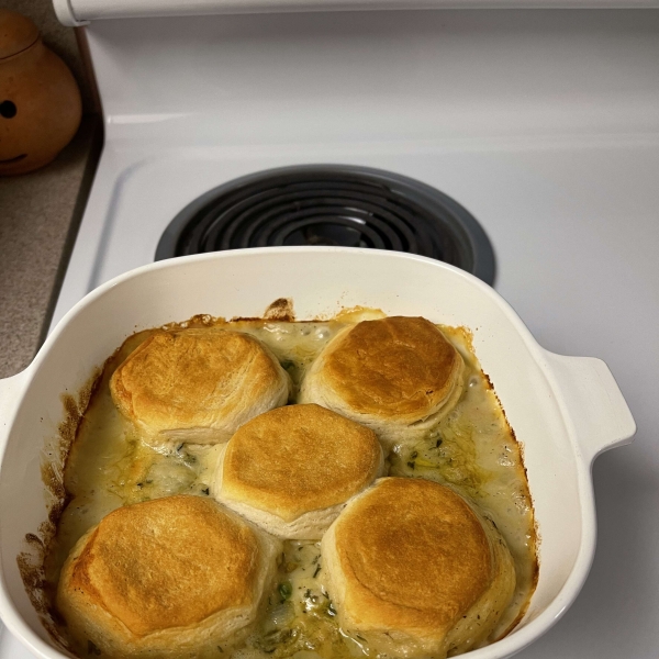 Transfer chicken, vegetables, and sauce into a 7x11-inch baking dish. Arrange biscuits on top of the filling.