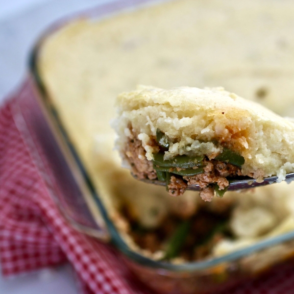 Shepherd's pie is easy and versatile. This recipe features a beefy filling with canned green beans and tomato sauce and a simple mashed potato topping.