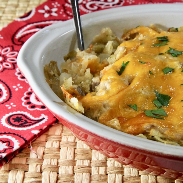 Onions are sauteed in butter and then layered with crushed potato chips, mushroom soup and cheese.