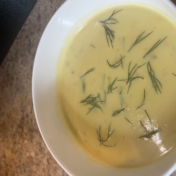 Stir in cream and bring soup to a low simmer to heat through. Ladle into bowls and garnish with dill.