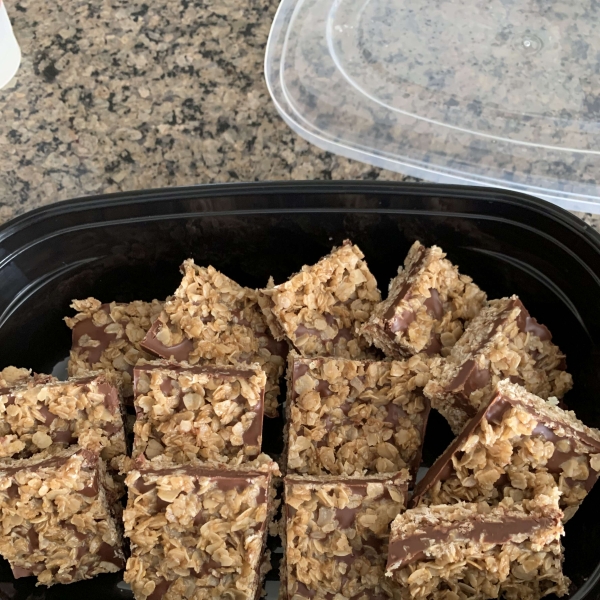 Crumble remaining oat mixture over chocolate layer, pressing down gently. Cover and refrigerate for 2 to 3 hours or overnight. Bring to room temperature before cutting into bars.