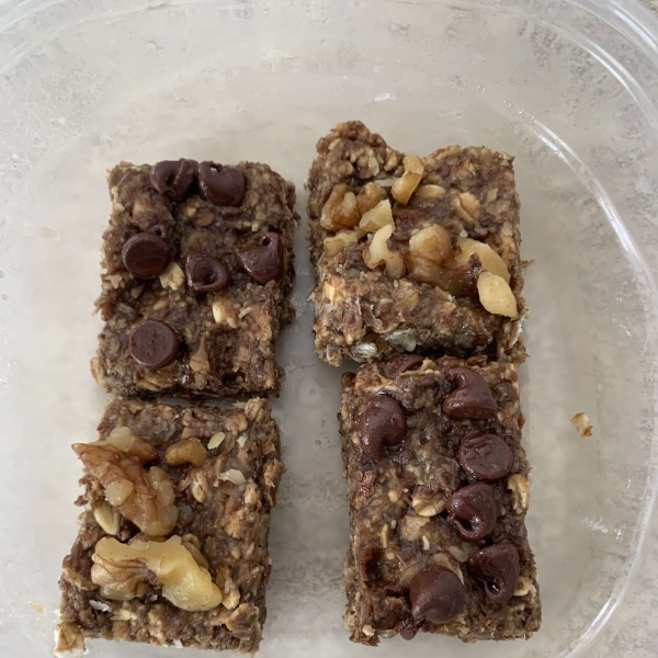 These protein bars with chocolate, raisins, and cranberries never go into the oven. Just mix the ingredients and refrigerate until firm.