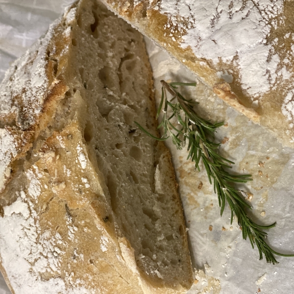 This is a very easy bread to make without any kneading. Bake in a Dutch oven or heavy casserole dish. The bread comes out very crusty and with huge holes throughout, just like at the bakery.