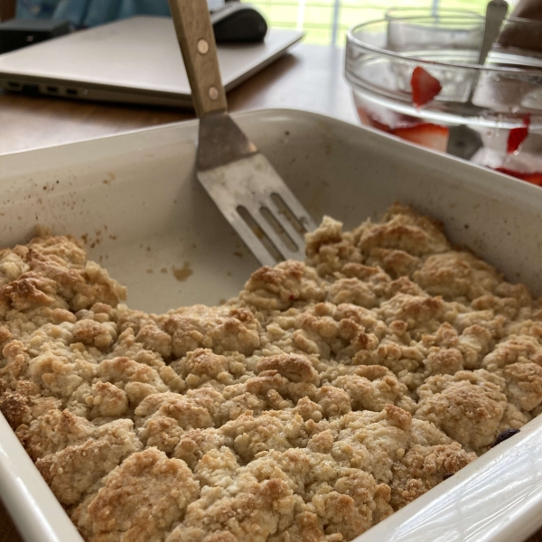Sift together flour, sugar, baking powder, salt, and nutmeg in a large bowl. Cut in butter with 2 knives or a pastry blender until mixture resembles coarse crumbs. Beat together milk and egg in a small bowl; stir into flour mixture until batter is just blended. Spread batter in the prepared baking pan.