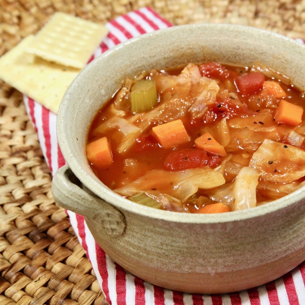 Cabbage, carrots, celery, sweet onion, and just the right amount of ketchup (yes, ketchup) make this lovely vegetable soup. Best if cooked one day ahead, refrigerated overnight and heated just before serving.