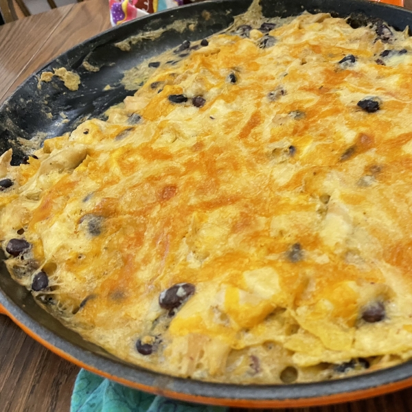 For easy and delicious one-pot meal enchiladas, fill your skillet with sour cream, green chiles, olives, chicken breasts, and torn tortillas.