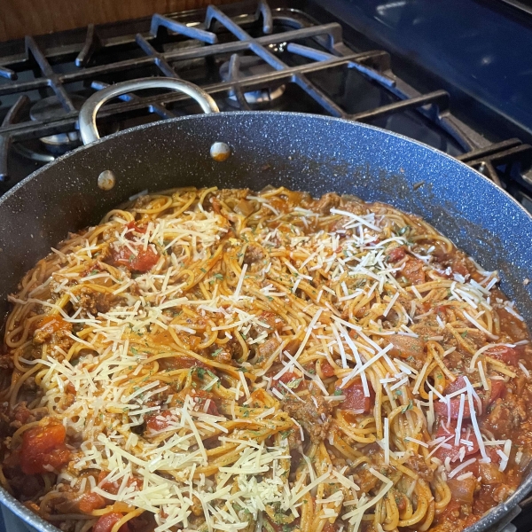 Break spaghetti into thirds and add to the pot; cover and simmer, stirring often, until pasta is tender, about 20 minutes. Serve topped with Parmesan cheese.