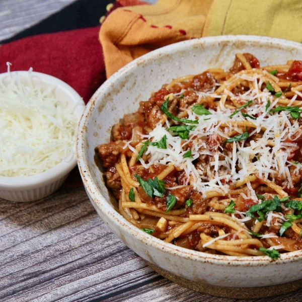 A flavorful ground beef-based tomato sauce simmers in a Dutch oven with whole wheat spaghetti for a quick and easy weeknight dinner.
