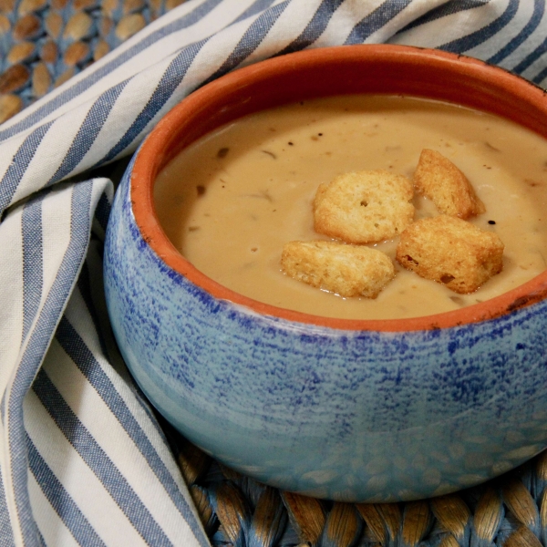 Onions are long simmered in beef broth, then thickened with flour and enriched with cream and shredded cheese in this easy soup.