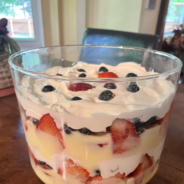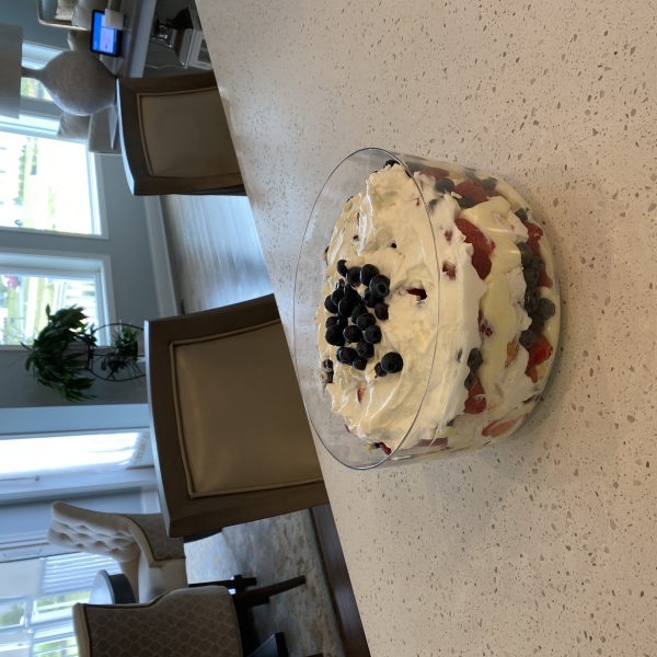 Layer 1/2 of the angel food cake in a trifle bowl. Top with 1/2 of the lemon pudding mixture, 1/2 of the strawberries, and 1/2 of the blueberries. Spread 1/2 of the whipped cream over berries. Repeat layers. Cover and refrigerate until ready to serve.