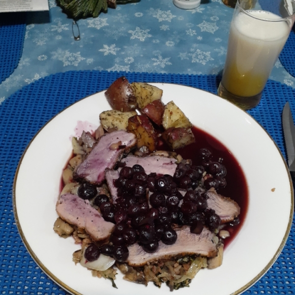 An elegant and eye pleasing menu of pan-seared duck breast with blueberry sauce served on a bed of bok choy, wild mushrooms, pancetta, and shallots. Roasted potatoes seasoned with rosemary and thyme complete this meal, perfect for any special occasion.