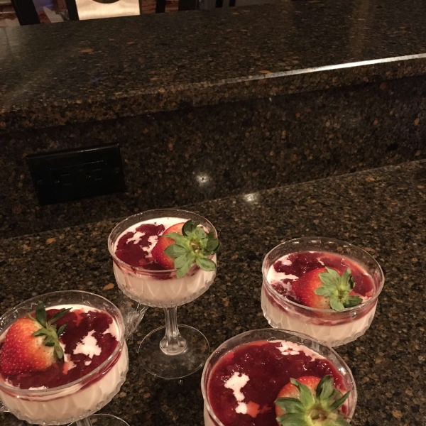 A sauce made of fresh strawberries tops molded cooked cream for a delicious take on the classic Italian dessert.