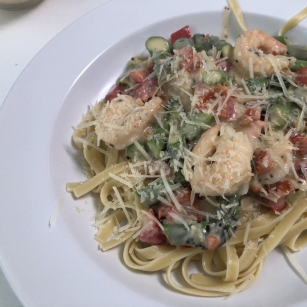 Bell peppers add vibrant color to this quick pasta dish with asparagus and shrimp tossed in rich, flavorful Alfredo sauce.