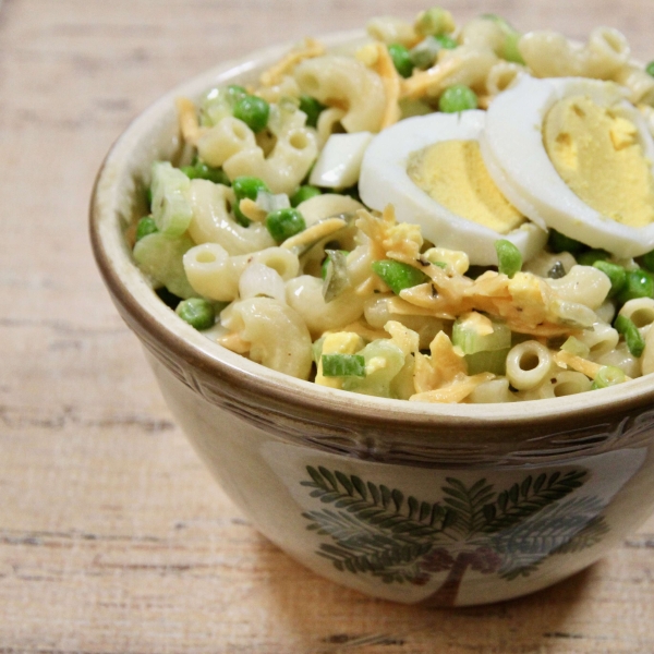 This salad has a definite sweetness about it. A bit of sugar is added to the dressing and sweet pickles are tossed in with the peas, onions, celery, eggs and cheese. Makes six generous servings.