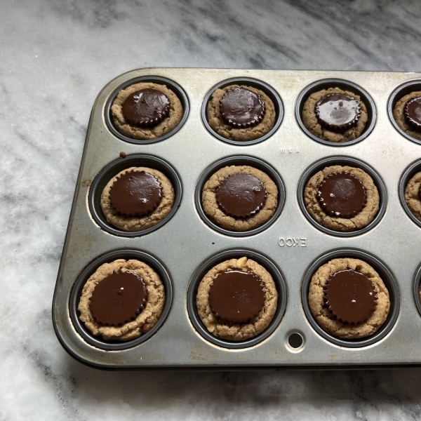 These super cute peanut butter cookies are baked in mini muffin pans and have a chocolate peanut butter cup center.