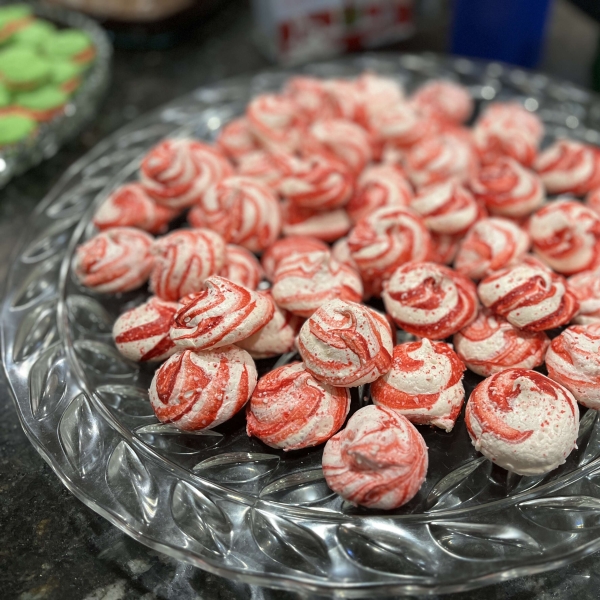 In a large glass or metal mixing bowl, beat egg whites, salt, and cream of tartar to soft peaks. Gradually add sugar, continuing to beat until whites form stiff peaks. Drop by spoonfuls 1 inch apart on the prepared cookie sheets. Sprinkle crushed peppermint candy over the cookies.