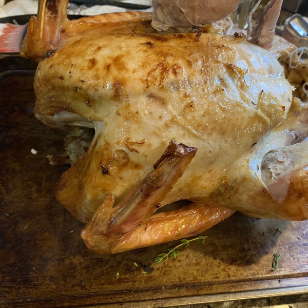 Roast turkey in the preheated oven, uncovered, until no longer pink at the bone and the juices run clear, about 3 1/2 to 4 hours. Carefully turn turkey breast-side up about 2/3 through the roasting time, and brush with remaining butter. An instant-read thermometer inserted into the thickest part of the thigh, near the bone, should read 165 degrees F (74 degrees C).