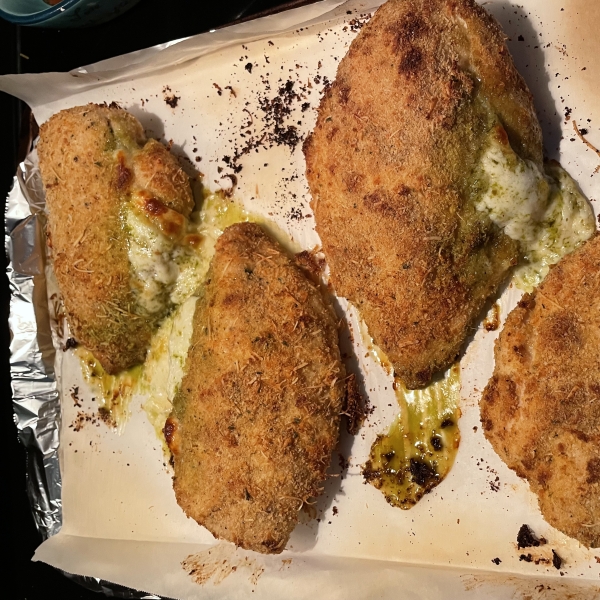 This quick and easy baked keto chicken breast recipe is stuffed with pesto and mozzarella cheese and coated in eggs and Parmesan cheese.