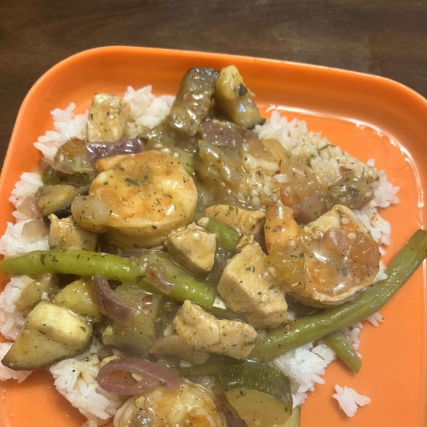 Stir in zucchini, okra, green beans, eggplant, and bitter melon; cover and cook until the vegetables are tender, about 10 minutes.