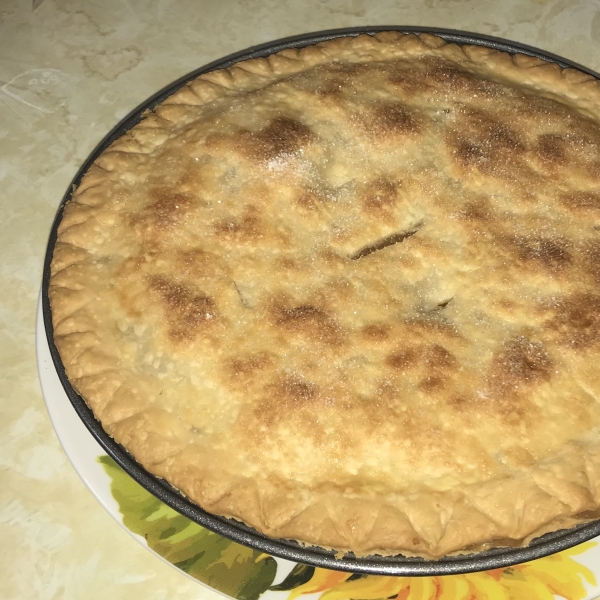 Cool slightly and pour mixture into pastry-lined pie pan. Cover with top crust and seal. Make a few steam vents in crust, then brush with milk and sprinkle with sugar. Place in preheated oven and bake for 35 minutes. Serve chilled or at room temperature.