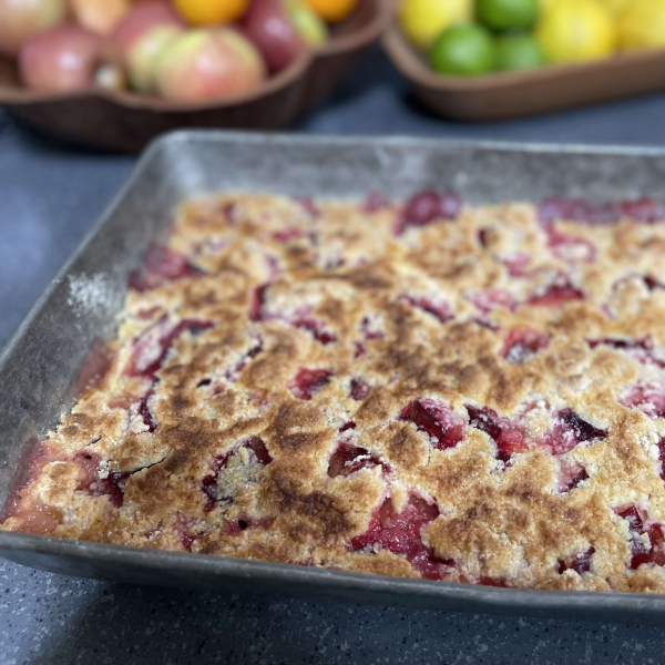 Mix together flour, remaining 3/4 cup sugar, baking powder, and salt in a large bowl. Stir in beaten egg and spoon mixture over plums. Drizzle batter with melted butter.