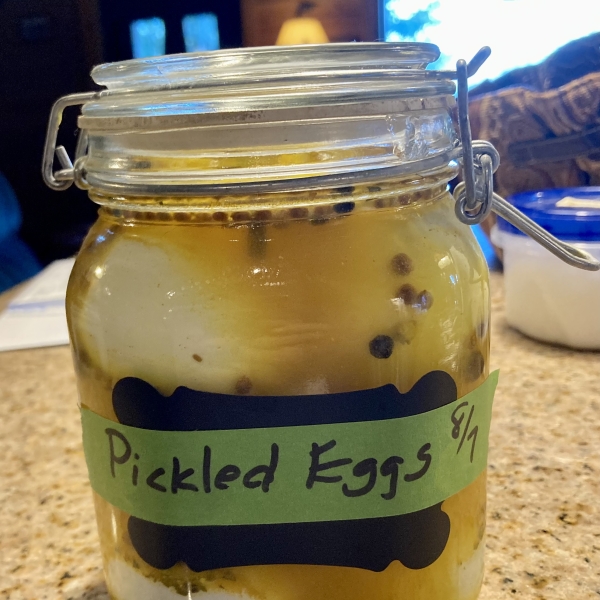 These simple to make pickled eggs are a great snack along with pretzels. For hotter eggs pierce the yellow chili peppers with a sharp knife and/or add other hot peppers.