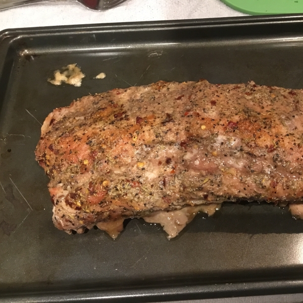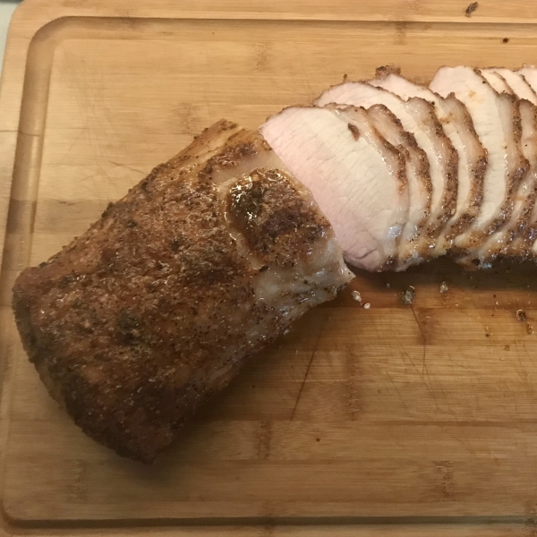 Bake in the preheated oven until pork is slightly pink in the center, about 50 minutes. An instant-read thermometer inserted into the center should read at least 145 degrees F (63 degrees C). Cover pork loosely with aluminum foil and let rest for 10 minutes before slicing.