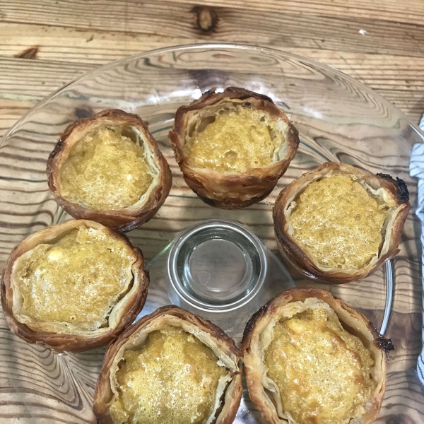 Place a piece of dough in each muffin cup. Dip your thumb lightly in some cold water. Press your thumb into the center of the swirl; push dough against the bottom and up the sides of the cup until it reaches least 1/8 inch past the top. Fill each cup 3/4 of the way with custard.